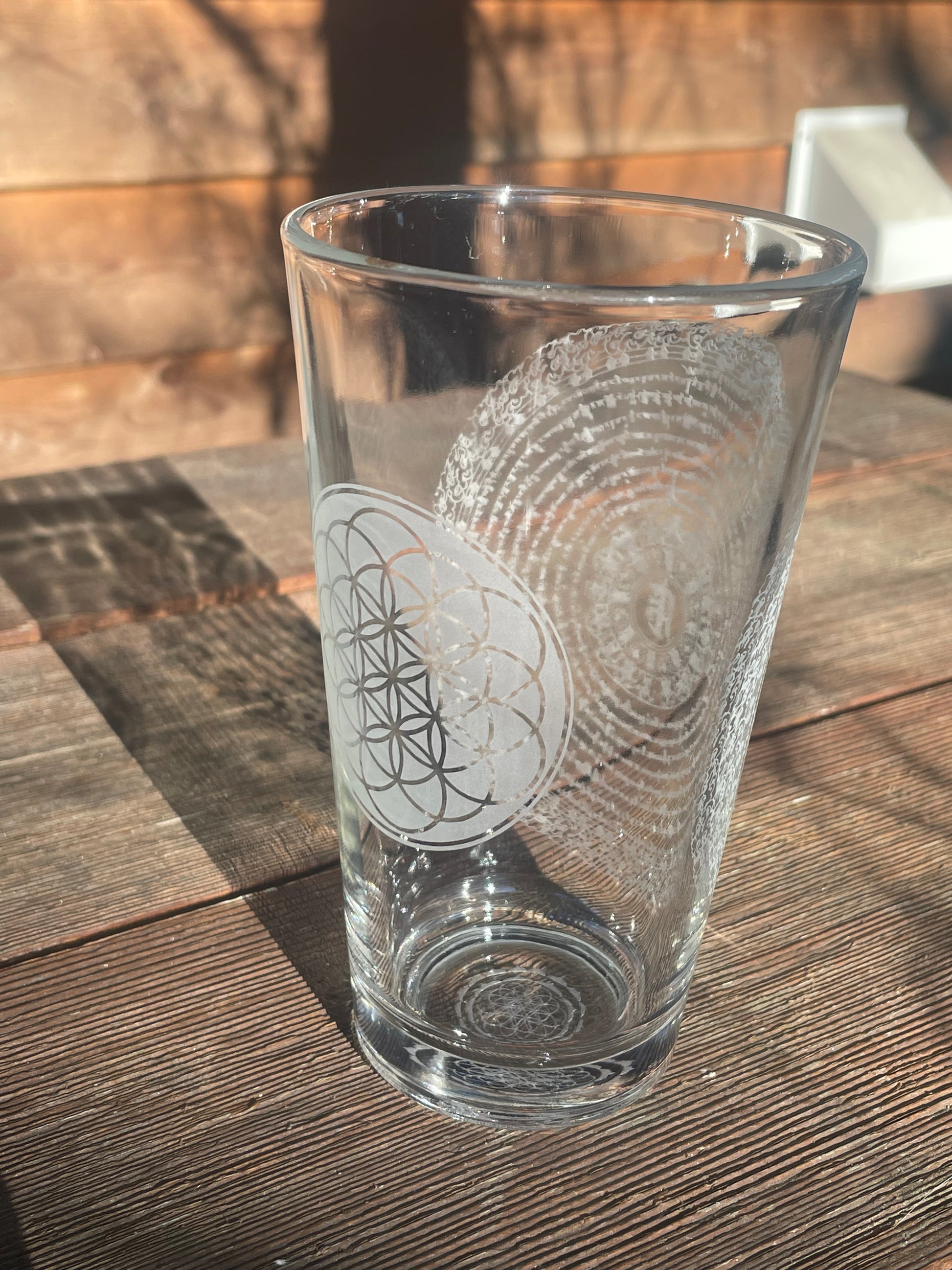Namgyalma Mantra and Flower of Life 480ml Clear Pint Glass |Sacred Geometry Drinkware