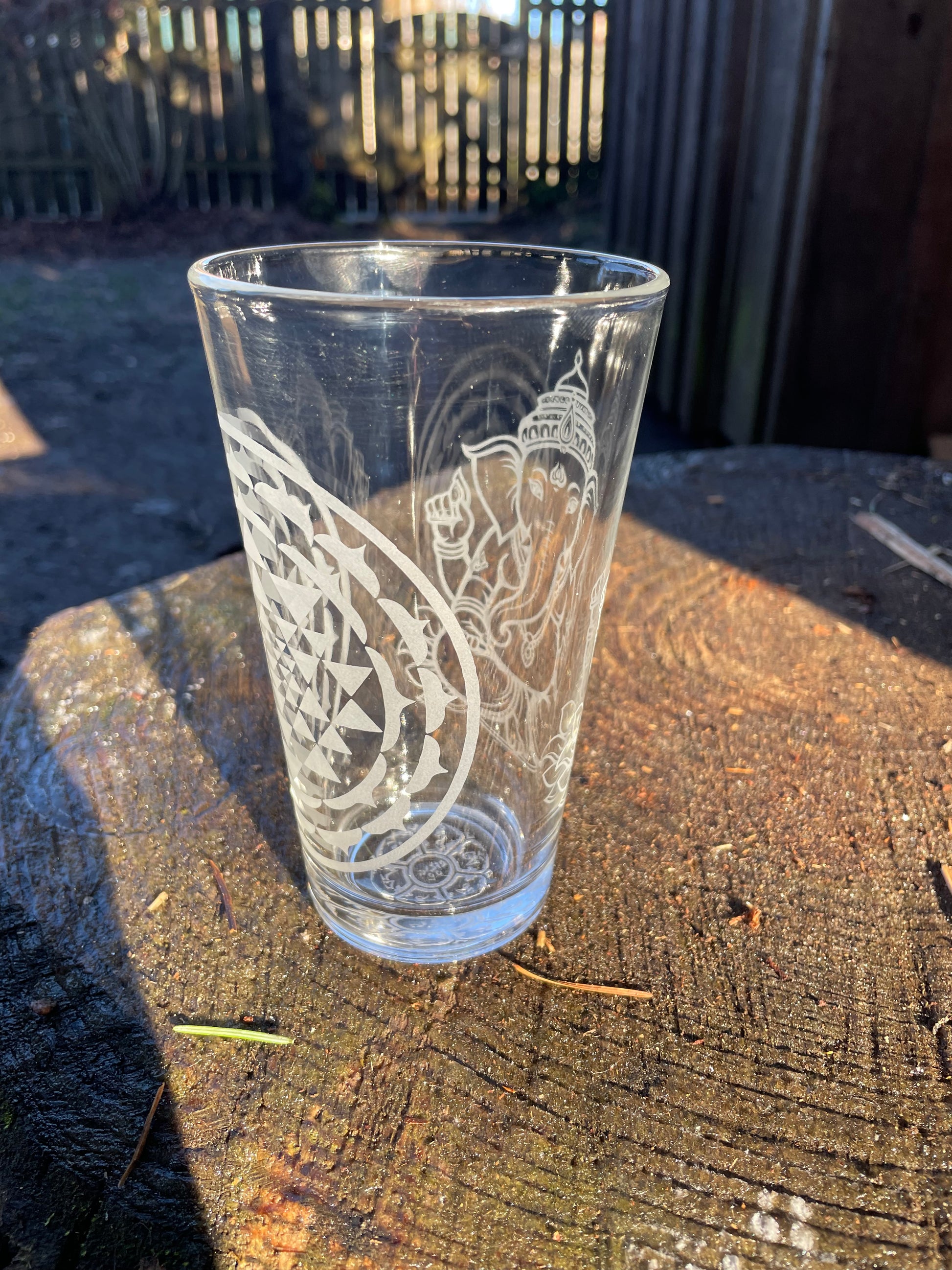 Sri Yantra and Ganesha 480ml Etched Pint Glass | Sacred Geometry Drinkware